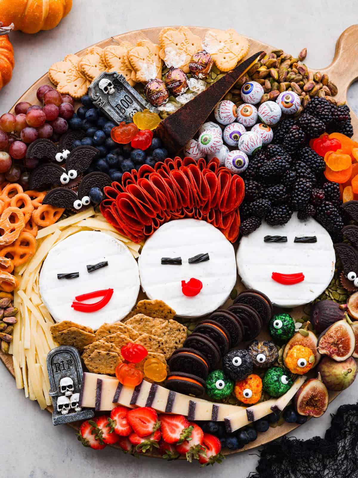 Some people like to let the food speak for itself, but I like to add a few different festive Halloween items to the board to really take it over the top. I used a couple of small RIP gravestones, and that was it for this Hocus Pocus charcuterie board. You could also add in a skeleton hand, some fake spiders, and even some black netting to make it extra spooky! Just make sure that whatever you use is large and can’t be mistaken for food. You don’t want anyone accidentally eating it!