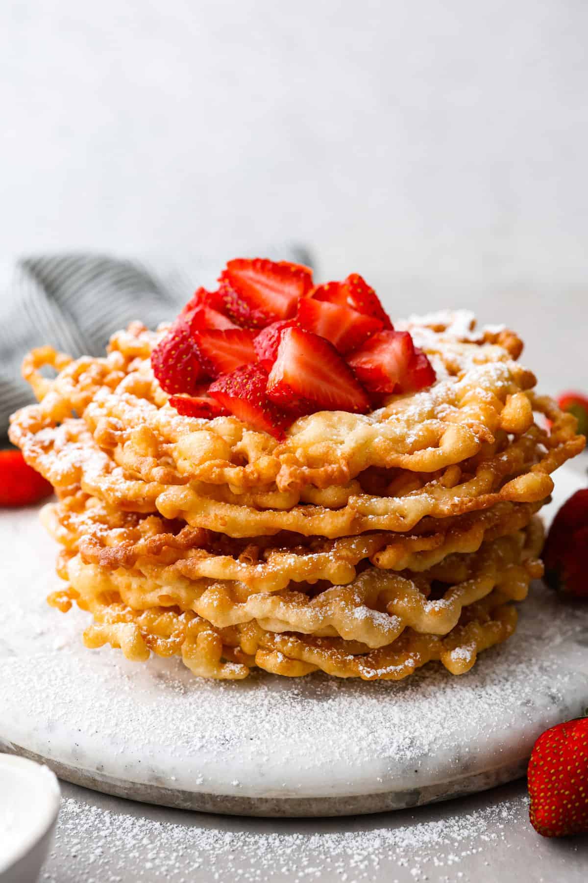 Like most fried foods, funnel cakes are best eaten fresh! They will store in an airtight container on the counter for up to 2 days. The taste will change once they cool off, but they are still super yummy. I would recommend storing them without any toppings to keep them as fresh as possible.