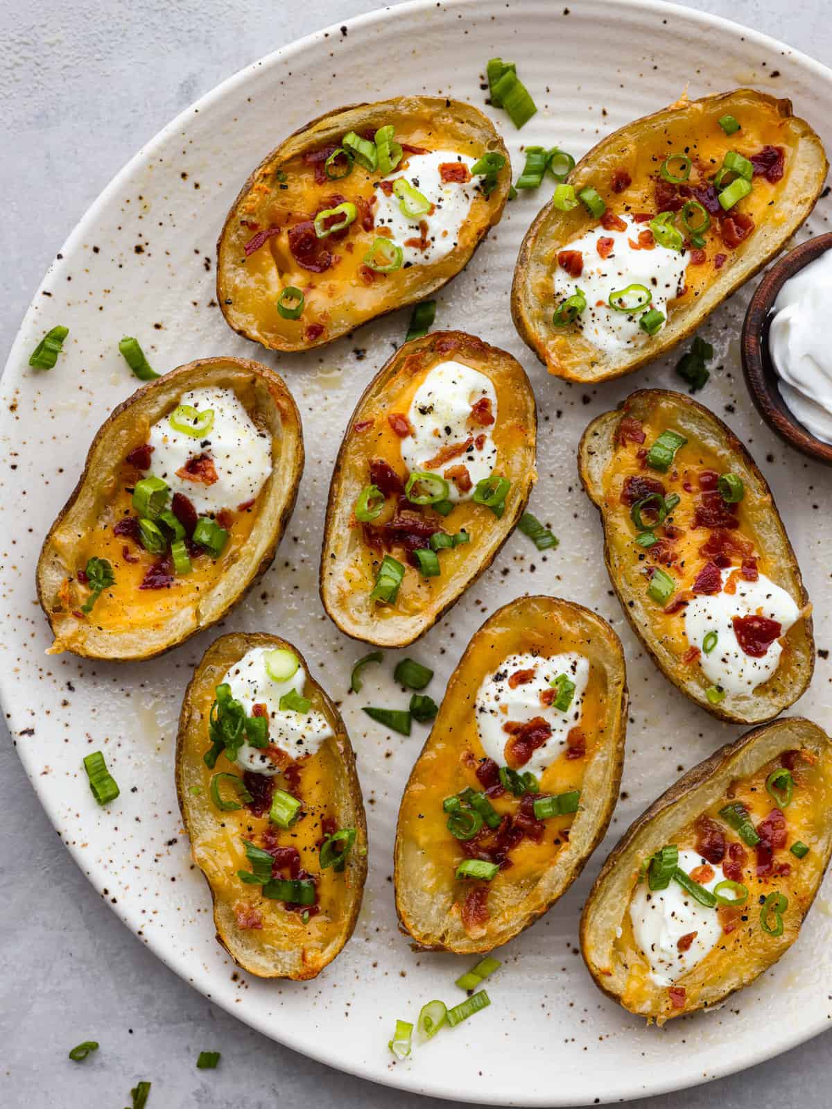 - Garnish Potato Skins: Remove the skins from the basket and fill them with sour cream, bacon, and sliced green onions.