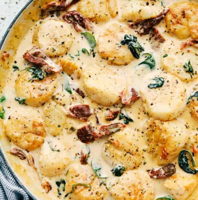Get ready to have your taste buds blown away by the divine dish that is creamy Tuscan garlic scallops. This dish is not only easy to make, but it’s also an absolute crowd-pleaser that’s sure to impress even the pickiest of eaters. The sun-dried tomatoes release so much flavor into the sauce, while cream, wilted spinach leaves and garlic give it body. Then combined with tender, buttery scallops, it’s a knock-out dinner!