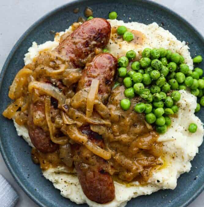 - Assemble, Add Gravy: Plate your mashed potatoes with a couple sausages on top, and top the whole thing with a generous helping of onion gravy.