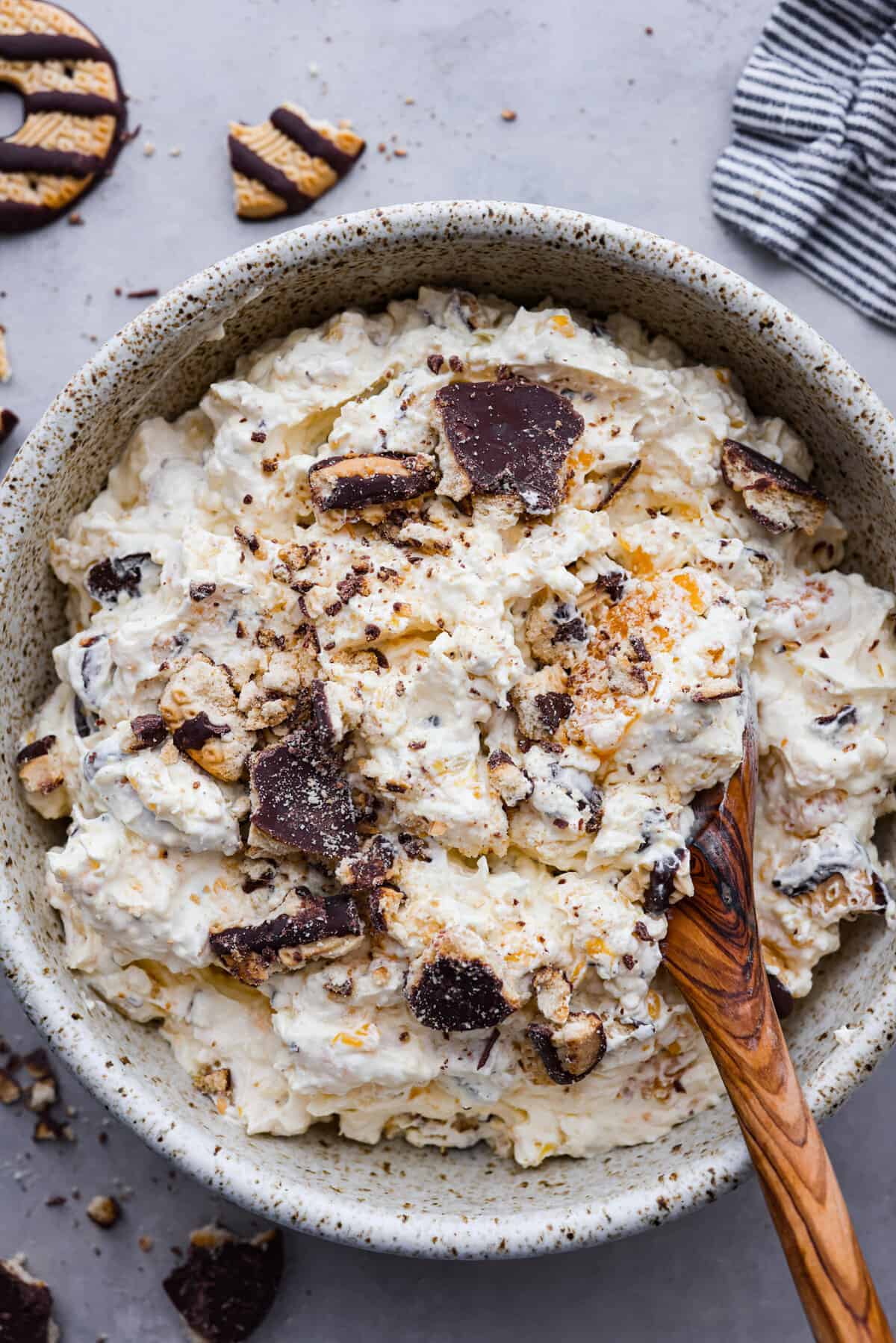Top view of cookie salad in a bowl with a wooden serving spoon.