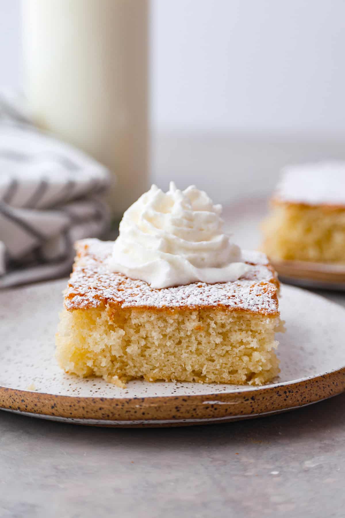 This hot milk cake is perfect served with some fresh whipped cream on top and fresh fruit. On a cold night, I love it with hot chocolate and a drizzle of caramel sauce over the top (you can drizzle that on the hot chocolate too, yum!). It’s also delicious with a scoop of vanilla ice cream, or whatever your favorite flavor is. This milk cake has a really subtle vanilla flavor that goes perfectly with whatever you want to eat with it!