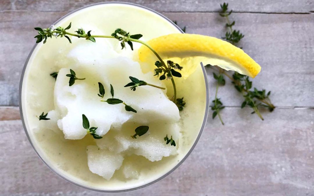 Pour into two serving cups, garnish each with a sprig of fresh thyme and a lemon wheel, and serve.