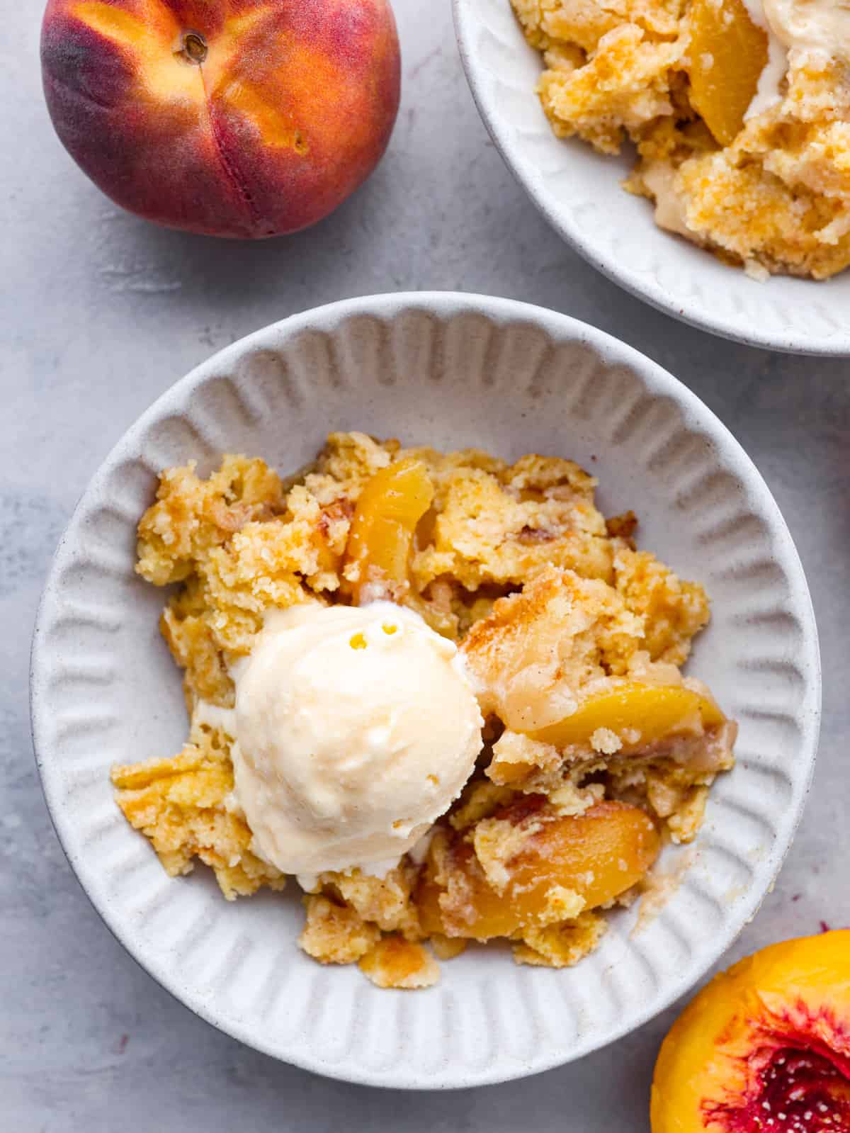 Peach dump cake is delicious served straight out of the pan or (in my personal opinion) even better when you serve it with a scoop of vanilla ice cream! The cake itself is so warm and ooey gooey, the ice cream just melts beautifully on top. This is such a great dessert, no one will know it only took 10 minutes to throw it together! Dump cakes are a game-changer and perfect for you busy moms out there. You should try my apple and pumpkin dump cake recipes next!