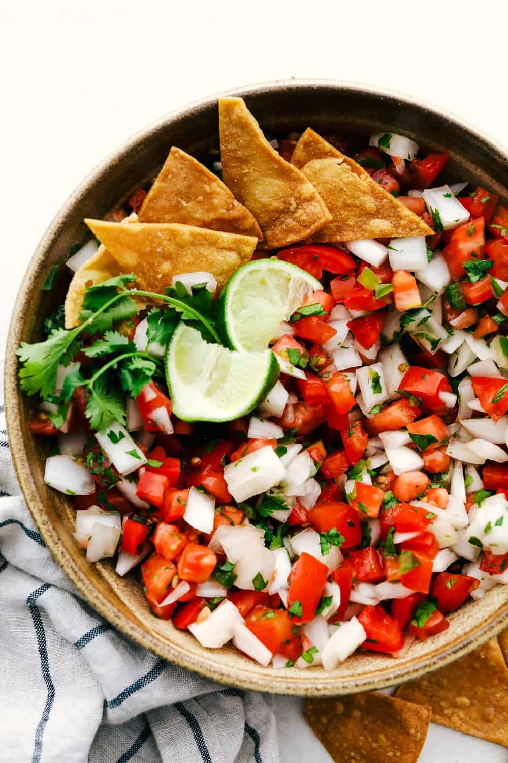 Pico de Gallo, also called salsa fresca, is a made-from-scratch salsa that is loaded with bold flavors from jalapeño, lime, cilantro, and juicy chunks of tomato and onion. It’s quick and easy to make, and you will be scraping the bottom of the bowl in no time!