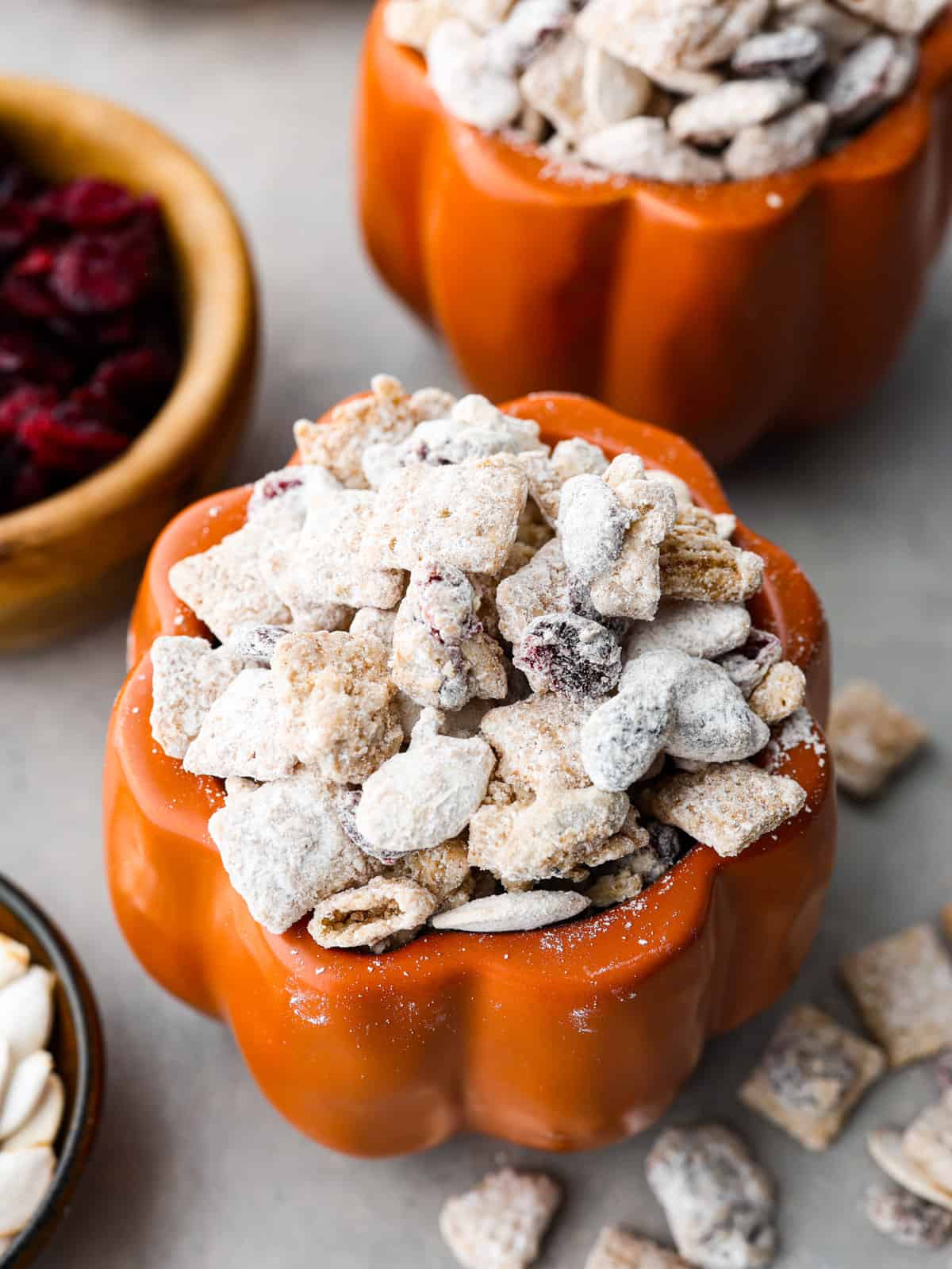 Prepare yourself for the best fall treat around- delicious pumpkin spice combined with one of the easiest treats on the planet – muddy buddies! The crunchy Chex Mix, chocolate, powdered sugar, and added cranberry and fall spices will make you want to finish the whole bowl.