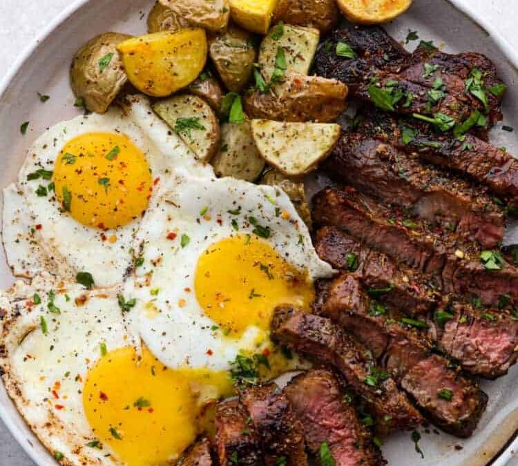Steak and eggs is a hearty and delicious breakfast packed with protein and flavor! Tender and juicy pan-seared steak is seasoned to perfection and served alongside eggs sunny side up.