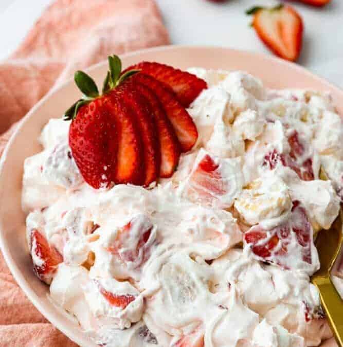 This strawberry cheesecake salad recipe is foolproof. All you need to do is mix your ingredients together and let your salad chill in the fridge until you’re ready to serve it!